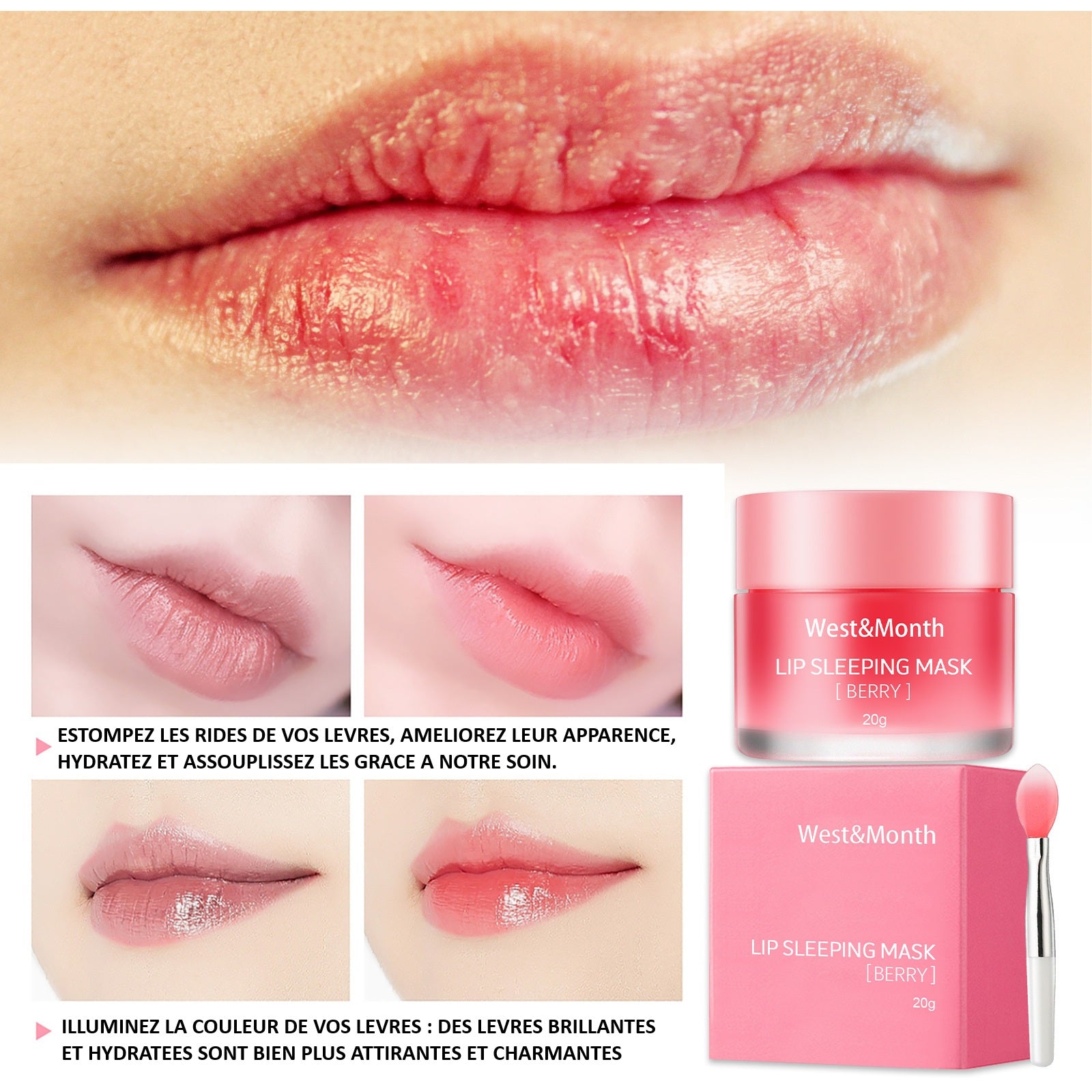 « West&Month lip sleep mask" n'est pas seulement un baume d'application. Il nettoie et restaure les imperfections de vos lèvres. il nourrit en profondeur afin de résorber les rides autour des lèvres, hydrater et assouplit les lèvres.